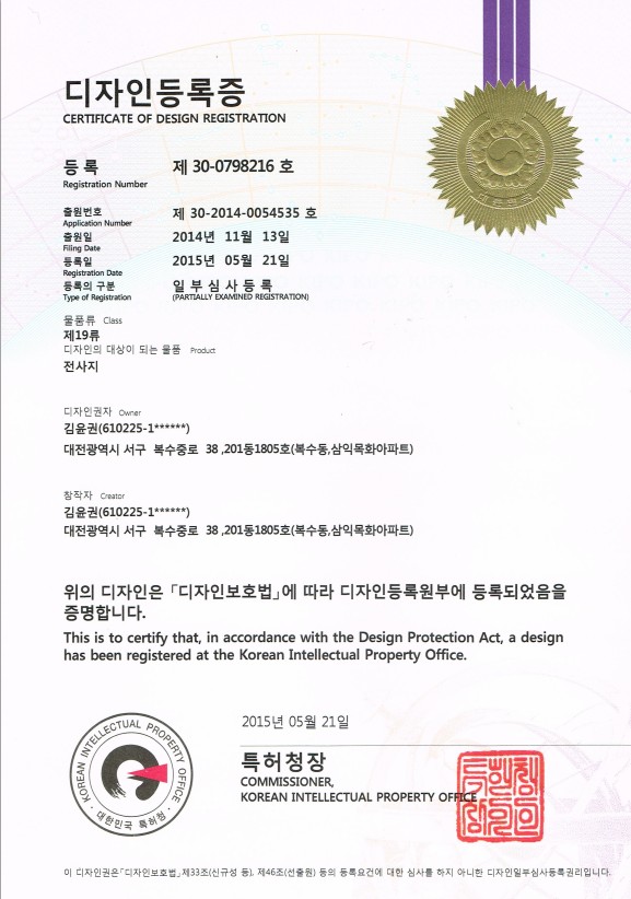 전사(손잡이용) 디자인등록증 Info. Writer 지웹 Date 20-02-18 14:24 View101 Reply0 Link Prev Next List Content 전사(손잡이용) 디자인등록증 Prev Next List