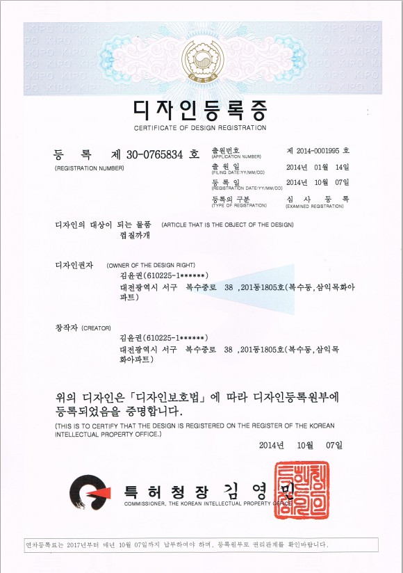 채칼(껍질까개) 디자인등록증 Info. Writer 지웹 Date 20-02-18 14:24 View168 Reply0 Link Prev Next List Content 채칼(껍질까개) 디자인등록증 Prev Next List